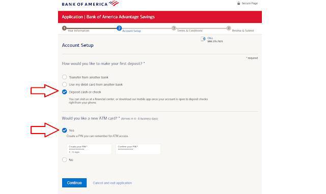 In here choose Deposit cash or check, Then Choose Yes under "Would you like a new ATM card ?". And click on Continue